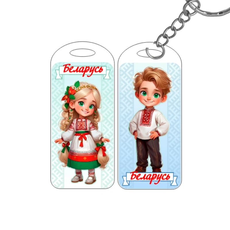 Очаровательный двусторонний брелок, выполненный в светлых пастельных тонах с использованием национальных мотивов. На каждой из сторон представлены милые персонажи в стилизованных белорусских народных костюмах: улыбающаяся девочка с длинными светлыми косами и цветами в волосах, а также задорный мальчик в вышиванке. Фон изделий украшен деликатным голубым и мятным геометрическим орнаментом, а в верхней и нижней частях расположены ленты с надписью «Беларусь». Корпус брелока имеет приятную скругленную форму и покрыт слоем прозрачной полимерной смолы, которая создает эффект объема, придает изображениям глянцевый блеск и надежно защищает их от механических повреждений. Изделие оснащено прочной металлической цепочкой с кольцом для крепления ключей.