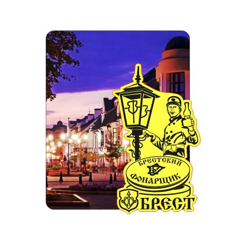 Премиальный двухслойный магнит, объединяющий современные технологии декора и уютную атмосферу старого города. Основание изделия представляет собой прямоугольник с полноцветным фотографическим изображением вечерней пешеходной улицы Советской в Бресте, утопающей в огнях фонарей. Поверх основного фона наложен второй фигурный слой, выполненный из золотистого зеркального полистирола. Этот слой воссоздает графический образ знаменитого брестского фонарщика с лестницей и керосиновой лампой, а также включает официальный герб города и каллиграфическую надпись «Брест». Фигурный элемент и подложка залиты слоем высококачественной оптической смолы, которая создает эффект глубокого объема, защищает зеркальную поверхность от царапин и придает всему изделию благородный стеклянный блеск. Зеркальные вставки эффектно играют на свету, превращая обычный сувенир в стильное интерьерное украшение.