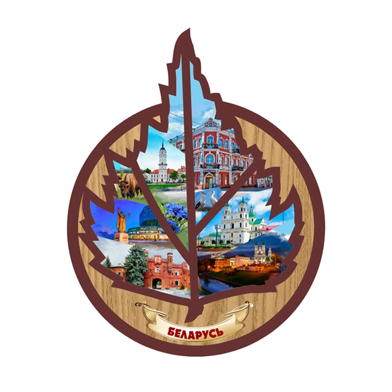 Декоративное настенное панно, выполненное в уникальной форме кленового листа, вписанного в круг. Внутри контуров листа расположен красочный коллаж из знаковых мест и символов Беларуси: величественные храмы, современные архитектурные объекты (Национальная библиотека), исторические замки и крепости, а также природные символы — зубр, аисты и цветы василька. Основание панно имеет приятную древесную текстуру, а нижняя часть украшена изящной лентой с надписью «Беларусь». Это изделие сочетает в себе природную форму и богатое культурное содержание, являясь идеальным украшением интерьера или памятным подарком.