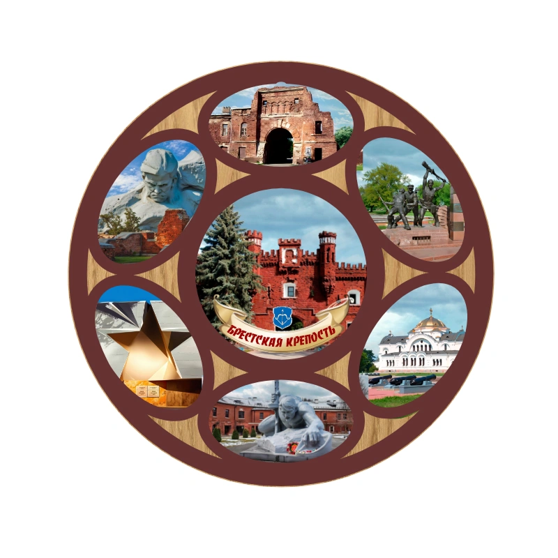 Круглое декоративное панно, представляющее собой художественный мемориальный коллаж в классическом обрамлении. В центральном медальоне изображены знаменитые Холмские ворота с официальной лентой «Брестская крепость». Вокруг центра расположены шесть овальных сегментов с ключевыми объектами мемориального комплекса: главный вход-звезда, монумент «Мужество», скульптурная композиция «Жажда», Свято-Николаевский гарнизонный собор, руины Белого дворца и памятник защитникам. Фон изделия имитирует благородную текстуру дерева, что в сочетании с глубоким коричневым кантом придает панно торжественный и завершенный вид.